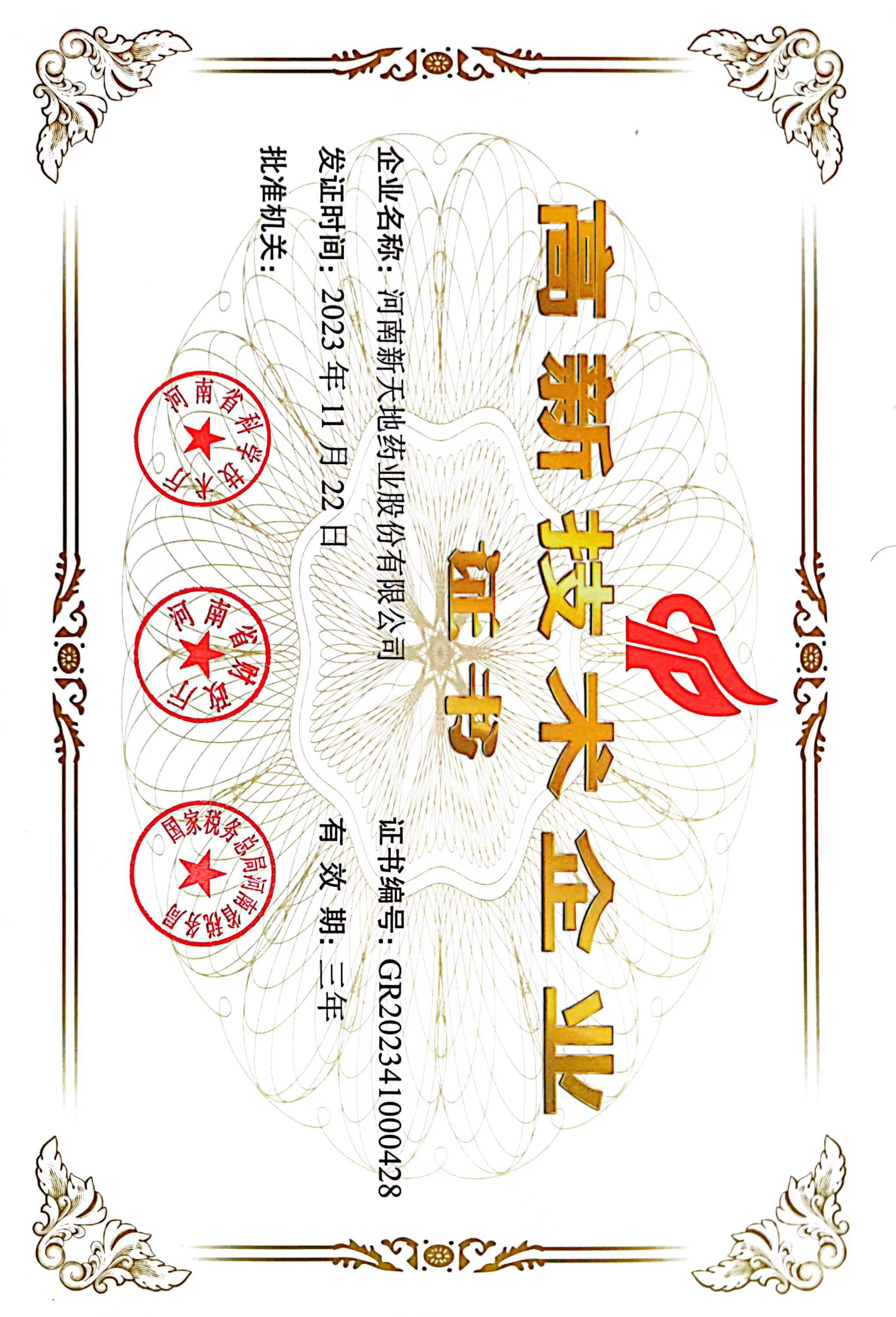 公司是国家级高新技术企业、、、商务部重点企业、、、河南省高新技术产品出口重点企业、、河南省创新型试点企业、、河南省知识产权优势培育企业、、河南省百户高成长性中小企业,,先后被批准成立河南省抗生素中间体工程技术研究中心、、河南省博士后研发基地。。。。公司先后于2006年和2007年获得英国摩迪国际认证有限公司ISO 9001:2000质量管理体系、、、BS EN ISO 14001:2004环境管理体系、、、OHSAS 18001:1999职业健康安全管理体系“三标一体”认证。。。。